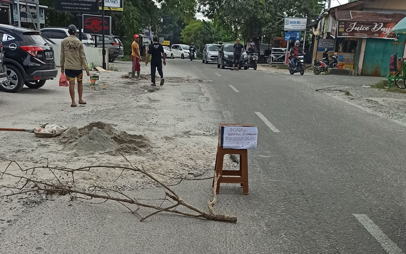 Penimbunan lubang dilakukan dengan menggunakan material pasir yang dicampur semen. Di lokasi perbaikan jalan, warga menyediakan kotak donasi untuk biaya material dan operasional perbaikan jalan.
