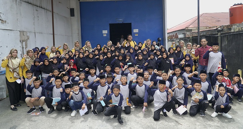 Puluhan murid MI Seminai Cemerlang Srigading Siak foto bersama saat berkunjung ke redaksi Riau Pos, Selasa (30/1/2024). Rombongan disambut Redaktur Pelaksana Riau Pos Syahrul Mukhlis. (DEFIZAL/RiauPos.co)