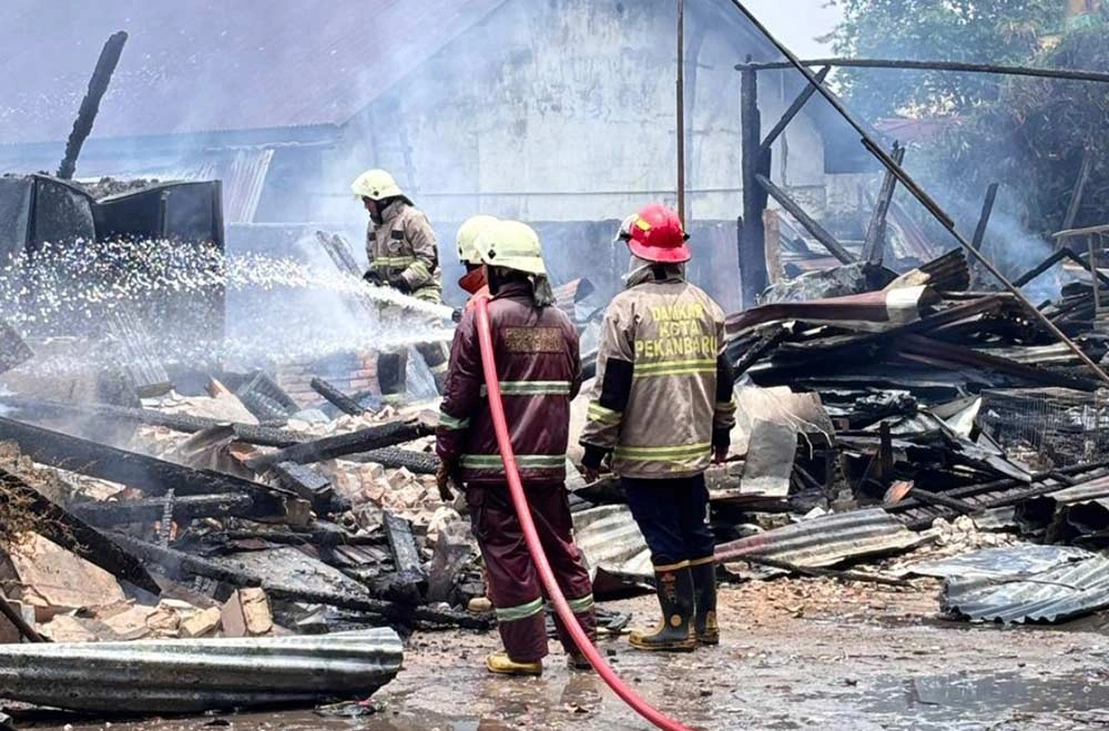 Petugas Pemadam Kebakaran Kota Pekanbaru menyemprotkan air ke puing-puing bangunan yang terbakar di Jalan Pepaya ujung, Kecamatan Sukajadi, Senin (30/3/2026) siang. Damkar pekanbaru untuk riau pos