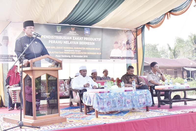 INHIL (RIAUPOS.CO) — Bupati Indragiri Hilir (Inhil) HM Wardan, menyerahkan penyaluran zakat produktif berupa perahu nelayan di Desa Pasar Kembang, Kecamatan Keritang, Jumat (1/11) siang.