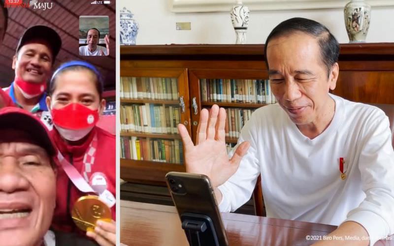 Presiden yang mengenakan kaus putih lengan panjang mengawali panggilan video tersebut dengan menyapa tiga atlet parabulu tangkis peraih medali emas Leani Ratri Oktila, Khalimatus Sadiyah Sukohandoko (Alim), dan Hary Susanto.