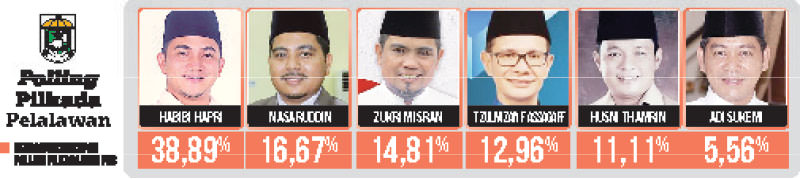 "Habibi Hapri masih unggul dibandingkan bakan calon lainnya," kata Direktur Riau Pos, M Hapiz, kemarin. Ketua DPRD Pelalawan periode 2014-2019 Nasaruddin menguat. Politisi muda yang mendapatkan dukungan 16,67 persen ini aman diperingkat kedua.
