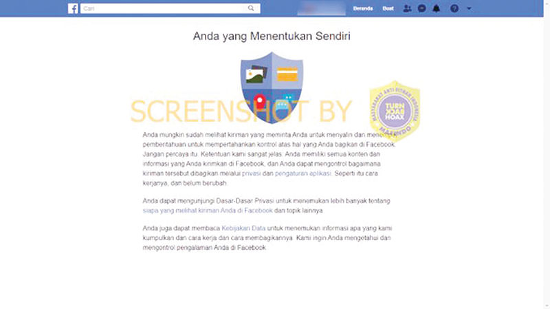"Anda mungkin sudah melihat kiriman yang meminta Anda untuk menyalin dan menempel pemberitahuan untuk mempertahankan kontrol atas hal yang Anda bagikan di Facebook. Jangan percaya itu. Ketentuan kami sangat jelas: Anda memiliki semua konten dan informasi yang Anda kirimkan di Facebook, dan Anda dapat mengontrol bagaimana kiriman tersebut dibagikan melalui privasi dan pengaturan aplikasi. Seperti itu cara kerjanya, dan belum berubah," tulis Facebook pada kanal FBFact.