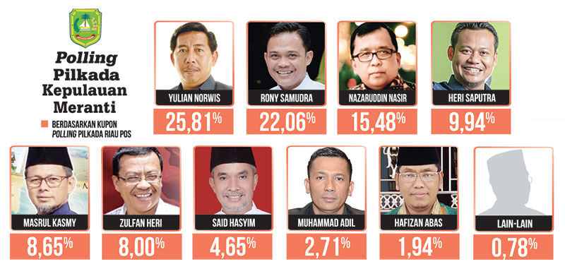 SELATPANJANG (RIAUPOS.CO) — Bakal calon Bupati Kepulauan Meranti periode 2020-2025 Yulian Norwis masih menguasai Polling Aspirasi Pembaca Riau Pos. Mantan Sekda Kepulauan Meranti mendapatkan dukungan 25,81 persen.