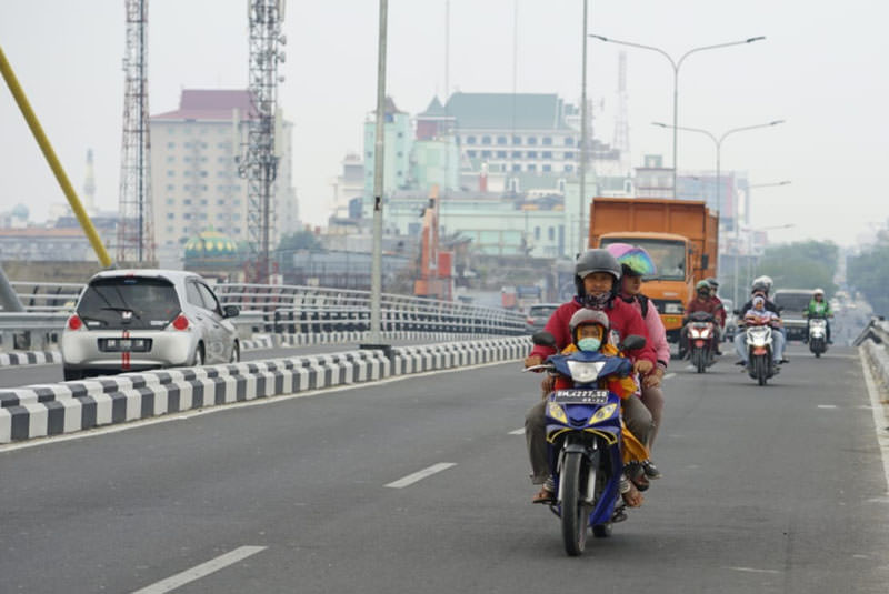 Pengendara melintas di Jembatan Siak IV dalam kondisi udara Kota Pekanbaru yang diselimuti kabut asap, Sabtu (10/8/2019). (MHD AKHWAN/RIAUPOS.CO)