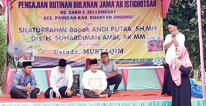 KUANTAN SINGINGI (RIAUPOS.CO) — Kepala Madrasah Tsanawiyah (MTs) Istiqomah Desa Sako Kecamatan Pangean, Ita Murni SPdI bangga dan senang diberi kesempatan menyampaikan aspirasinya secara langsung kepada Ketua DPRD Kuansing Andi Putra SH MH usai dilaksanakannya istigasah oleh ratusan jamaah pengajian di Dusun Indo Jaya, Desa Sako Pangean, Jumat (10/1).