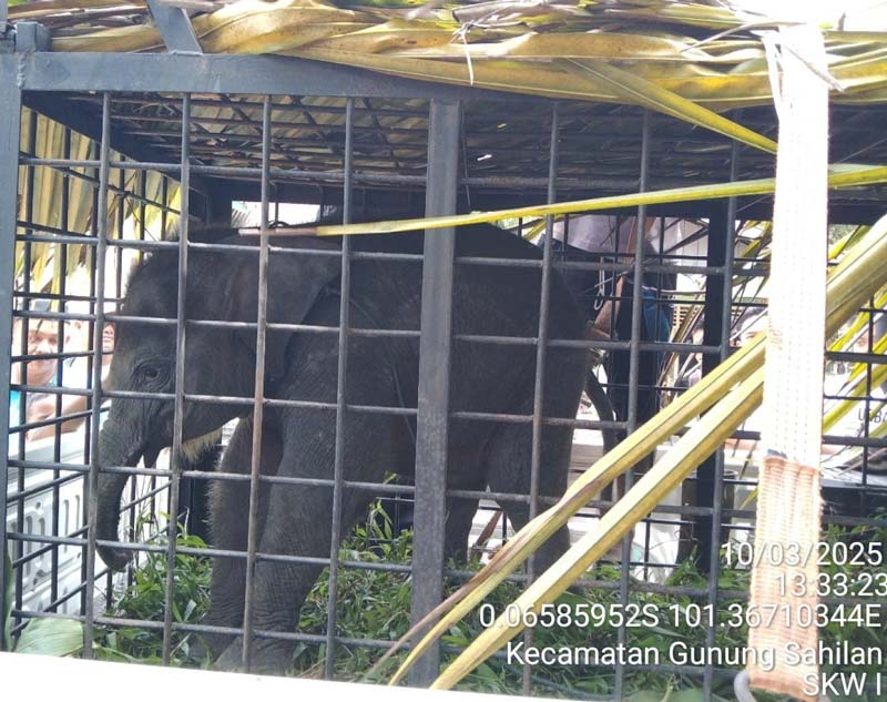 Bayi gajah Sumatera yang telantar ditinggal induknya dievakuasi Tim BBKSDA Riau, Senin (10/3/2025).