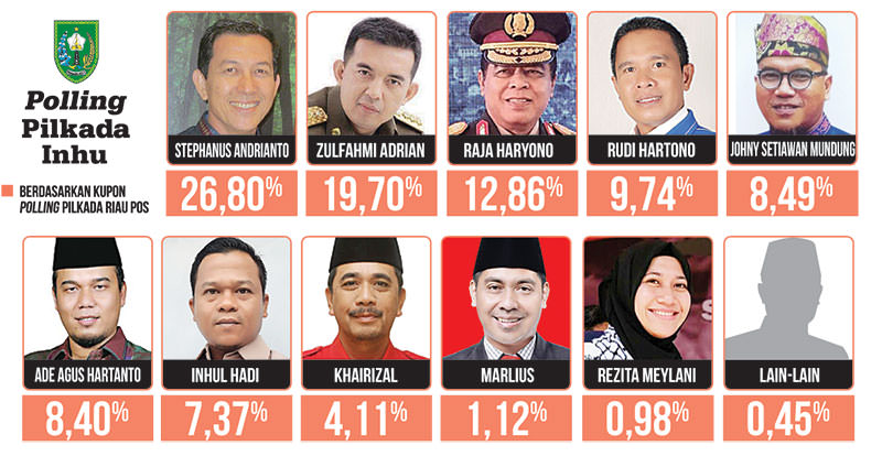 RENGAT (RIAUPOS.CO) — Dukungan masyarakat terhadap bakal calon bupati Kabupaten Indragiri Hulu (Inhu) pada polling aspirasi pembaca Riau Pos terus mengalir. Berdasarkan penghitungan Selasa (12/5), nama Stephanus Andrianto masih memimpin perolehan dukungan. Saat ini, Stephanus mendapat 26,80 persen suara. Ia masih kokoh di puncak.