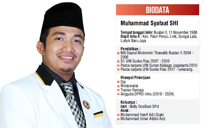 Tidak cukup melalui berbagai usulan disampaikan saat duduk sebagai anggota dewan, Muhammad Syafaat juga bersedia menerima amanah sebagai Ketua DPD PKS Kabupaten Inhu. Karena melalui partai juga bisa memberikan masukan dan saran untuk pembangunan Kabupaten Inhu lebih baik. Apalagi dengan adanya empat kursi anggota DPRD Kabupaten Inhu dari PKS dengan fraksi sendiri, dapat menyampaikan berbagai hal yang berpihak untuk rakyat. ’’Ini semua untuk kemajuan dan kesejahteraan masyarakat Kabupaten Inhu,” ucapnya, Sabtu (12/6).