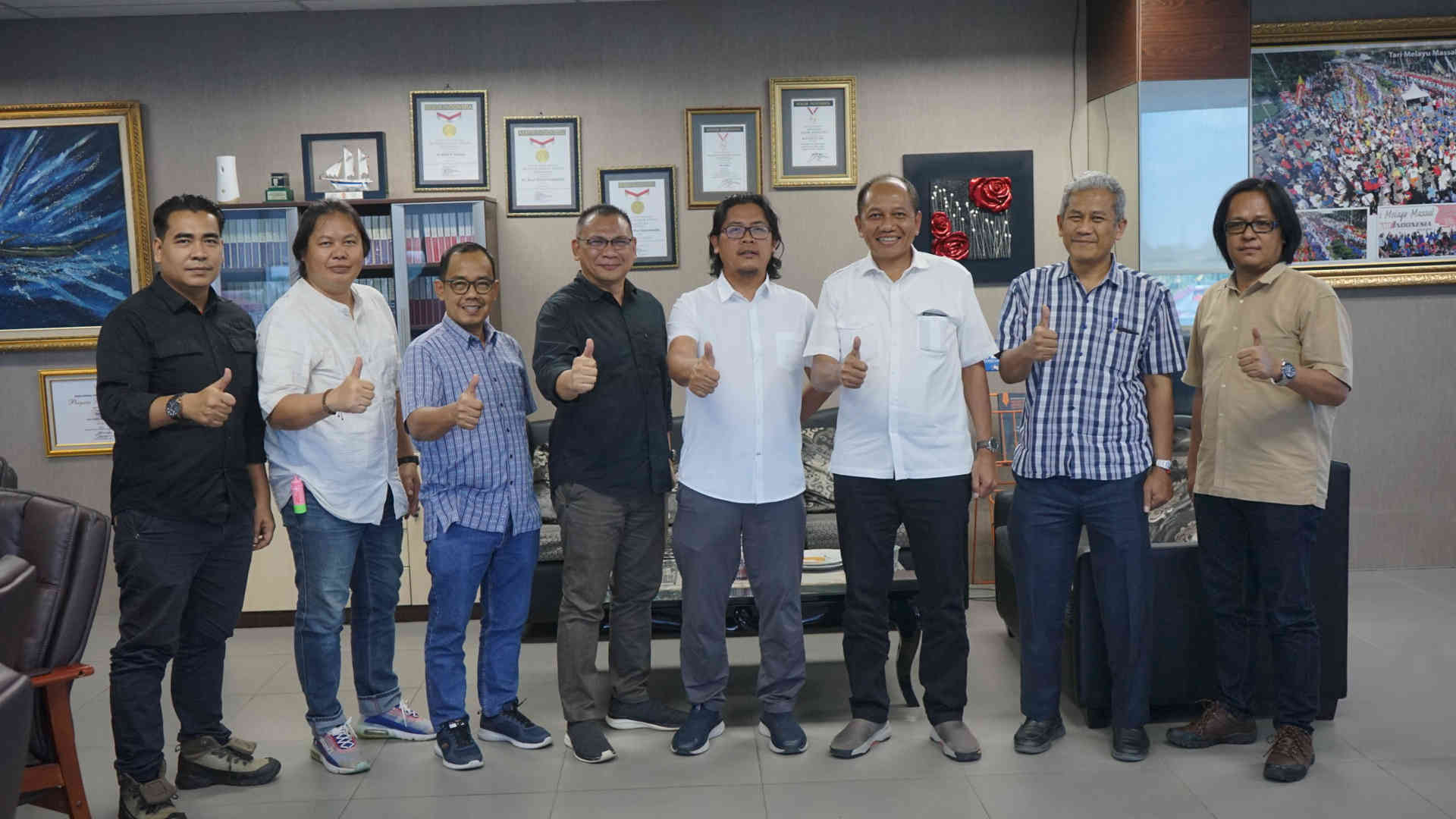 GM PLN UID Riau dan Kepri Parulian Noviandri (tiga kanan) bersama SRM Keuangan Komunikasi dan Umum PLN UID Riau dan Kepri Faharudin Fajar (dua kanan), Manajer Komunikasi dan Tanggung Jawab Sosial Lingkungan (TJSL) PLN UID Riau dan Kepri Tajuddin Nur (empat kiri) foto bersama Direktur Utama Riau Pos Ahmad Dardiri (empat kanan), Direktur Riau Pos Firman Agus (kanan), Direktur Riau Pos Asmawi Ibrahim (tiga kiri), Tim Iklan Riau Pos John Ermarizal (dua kiri) saat kunjungan ke kantor Riau Pos di Gedung Graha Pena Riau, Rabu (12/6/2024). ft : EVAN GUNANZAR/RIAU POS