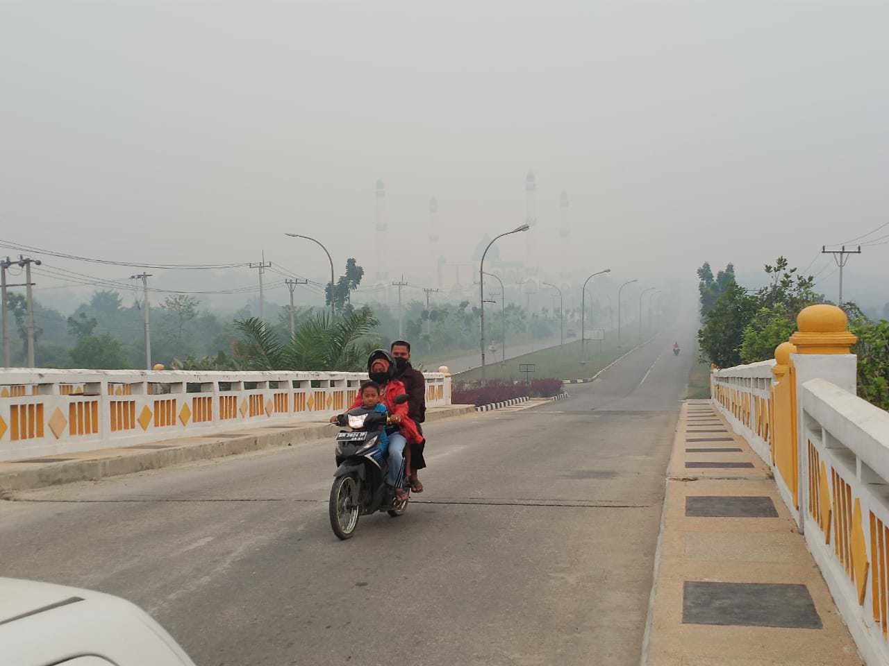 Pantauan Riau Pos di lapangan, kabut asap tebal membuat jarak pandang semakin berkurang, sehingga sangat mengganggu penglihatan para pengguna jalan khususnya sepeda motor. Bahkan, sejumlah bangunan tinggi tampak tidak terlihat jelas atau lenyap di telan jerebu seperti bangunan Masjid Agung Ulul Azmi Pangkalan kerinci Kabupaten Pelalawan.