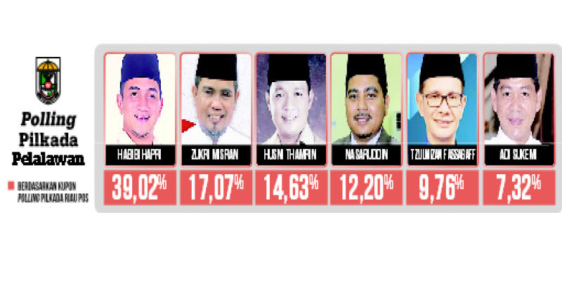 PANGKALANKERINCI (RIAUPOS.CO) — Bakal calon Bupati Pelalawan Habibi Hapri SH masih memimpin Polling Aspirasi Pembaca Riau Pos untuk Pilkada Pelalawan. Berdasarkan penghitungan Kamis (12/12) Ketua DPD PAN Pelalawan mendapatkan dukungan 39,02 persen. Dukungan ini menjadikan anggota DPRD Pelalawan periode 2014-2019 dan 2019-2024 sebagai peringkat teratas.