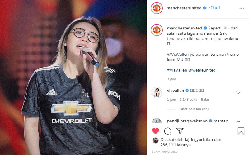 Via Vallen awalnya mengunggah foto sedang bernyanyi menggunakan jersey tandang The Red Devils berwarna hitam pada 25 Januari lalu. Dia merayakan keberhasilan Marcus Rashford dan kawan-kawan yang kala itu mampu menduduki puncak klasemen Liga Inggris.