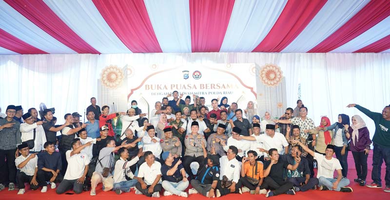 Kapolda Riau Irjen Pol Mohammad Iqbal berfoto bersama dengan insan media saat berbuka puasa di Mapolda Riau, Pekanbaru, Kamis (14/3/2025).