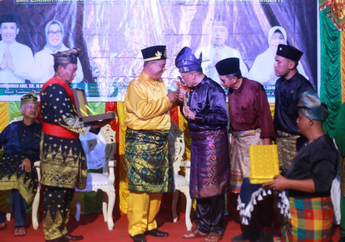 Penyerahan peninggalan kerajaan tersebut, berlangsung dalam puncak syukuran sambutan sultan ke tanah kediamannya, di Taman Cik Puan Selatpanjang, kemarin (13/6/2022) malam.