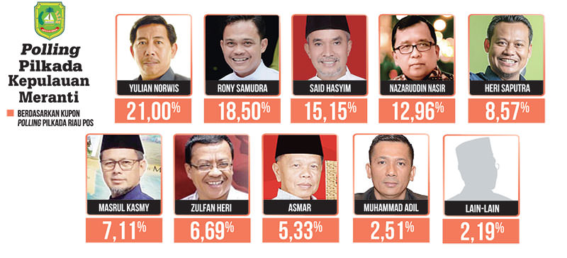 SELATPANJANG (RIAUPOS.CO) — Dukungan masyarakat terhadap bakal calon bupati Kabupaten Kepulauan Meranti pada polling aspirasi pembaca Riau Pos terus mengalir. Berdasarkan penghitungan Kamis (14/5), balon Yulian Norwis berhasil mempertahankan posisi puncak. Di penghujung akhir pekan ini, Yulian memperoleh dukungan sebanyak 21persen.