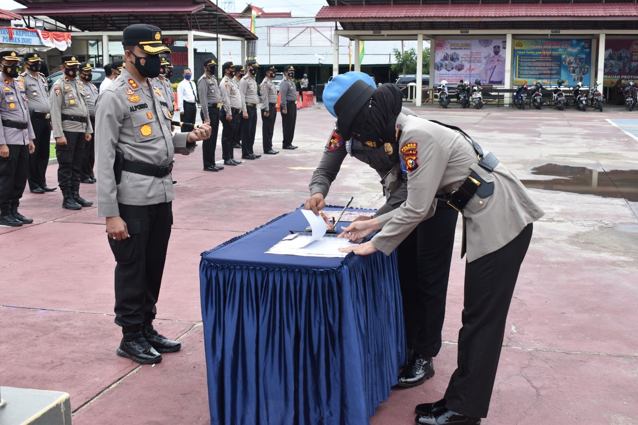 RENGAT (RIAUPOS.CO) – Kapolres Indragiri Hulu (Inhu), AKBP Bachtiar Alponso SIK MSi pimpin upacara serahterima jabatan (Sertijab) Kasat Reskrim dan Kapolsek Batang Gansal. Pelaksanaan upacara Sertijab ini dilaksanakan satu hari sebelum HUT RI ke 76 di halaman Mapolres Inhu, Senin (16/8/2021).