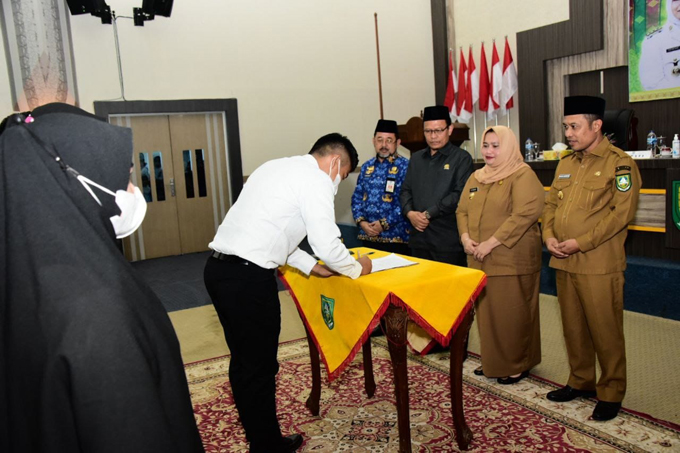 BENGKALIS (RIAUPOS.CO) – Bupati Bengkalis Kasmarni didampingi Wakil Bupati H Bagus Santoso menyerahkan Surat Keputusan (SK) Pegawai Pemerintah dengan Perjanjian Kerja (PPPK) tahap II formasi tahun 2021 di Ruang Dang Merdu Lantai IV Kantor Bupati Bengkalis, Senin (18/7/2022)
