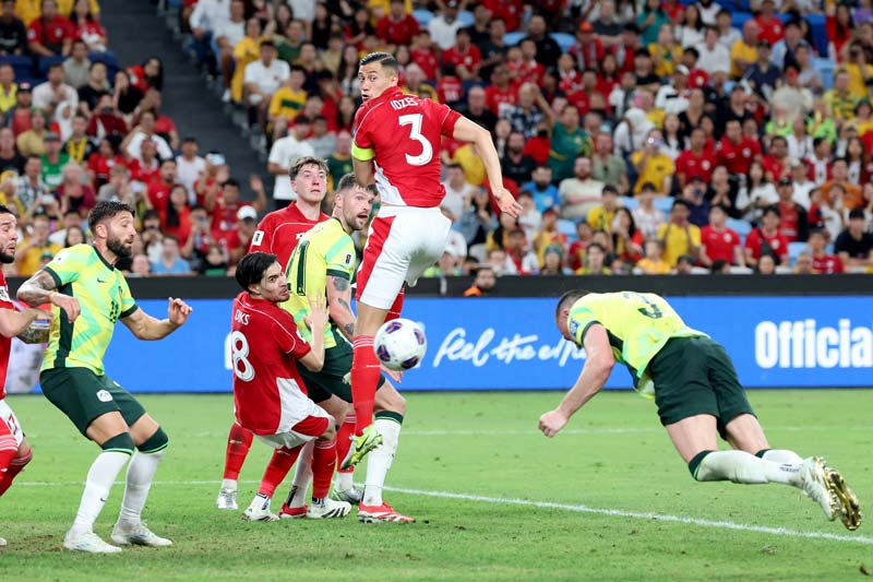Kapten Indonesia Jay Idzes (dua kanan) berupaya mengadang bola sundulan pemain Australia Lewis Miller (kanan) dalam pertandingan kualifikasi Piala Dunia FIFA 2026 di Stadion Allianz, Sydney, Kamis (20/3/2025). DAVID GRAY/AFP