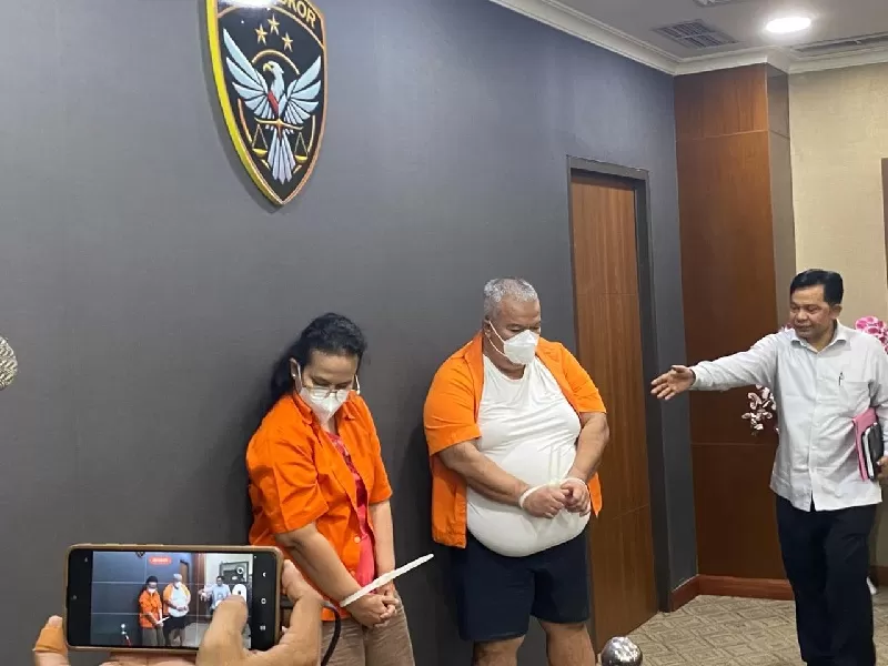 Mantan Direktur Utama PT SPR periode 2010–2015 Rahman Akil dan mantan Direktur Keuangan, Debby Riauma Sari menggunakan baju oranye setelah resmi ditahan oleh Kortas Tipidkor Bareskrim Polri. (BARESKRIM POLRI)