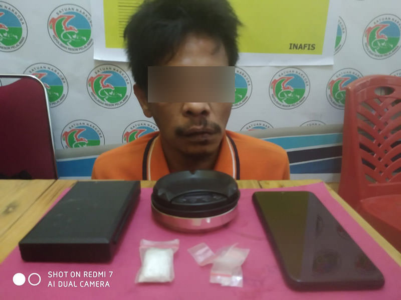 Kemudian, sambung Kasatres Narkoba, disaksikan sejumlah warga di TKP, polisi langsung melakukan penggeledahan terhadap tersangka. Hasilnya, petugas menemukan barang bukti 1 paket narkoba jenis sabu yang dibingkus plastik bening klep merah. Selain itu, dari tangan tersangka juga ditemukan 8 bungkus plastik klep merah dan 2 unit timbangan digital.