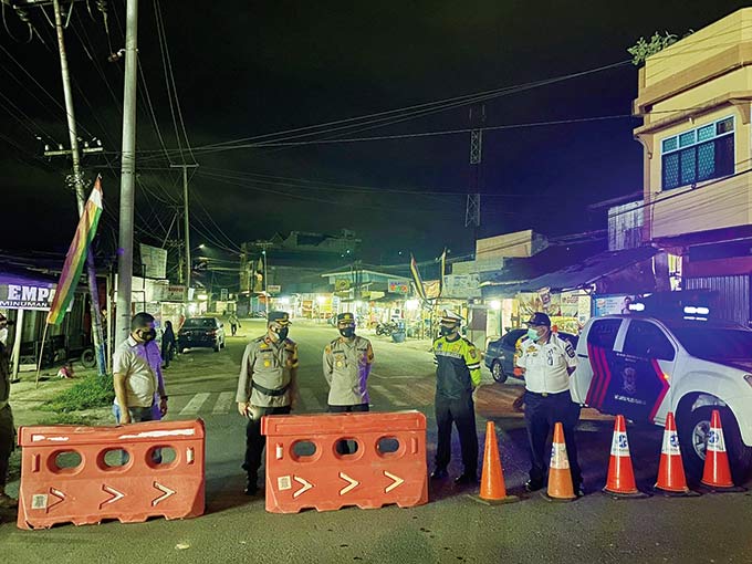 TIM gabungan yang terdiri dari Polri, TNI, Satpol PP, Diskes dan Dishub Kuantan Singingi (Kuansing) melakukan penyekatan di jalan menuju pusat Kota Telukkuantan, Sabtu (22/8) malam.