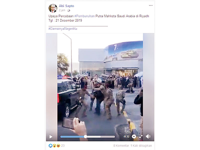 (RIAUPOS.CO) — Akun Facebook Abi Sapto membagikan kabar yang menghebohkan kemarin. Dia menginformasikan adanya upaya pembunuhan terhadap putra mahkota Kerajaan Arab Saudi. Katanya, upaya pembunuhan itu terjadi pada 21 Desember di Riyadh. Kabar tersebut disertai video berdurasi satu menit (bit.ly/UpayaPembunuhan) yang menunjukkan suasana seperti pengamanan pejabat di Timur Tengah.