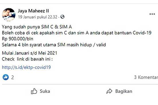 Berdasarkan konfirmasi dan penelusuran, ternyata narasi yang menyebut pemilik SIM C dan A akan mendapat bantuan Covid-19 senilai Rp 900.000 selama Januari hingga Mei 2021 adalah tidak benar alias hoaks.(jpg)