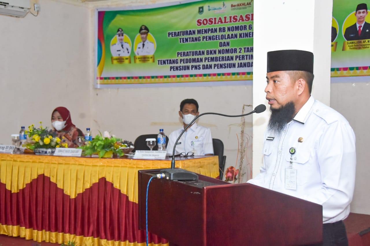 BENGKALIS (RIAUPOS.CO) – Guna mewujudkan aparatur sipil negara (ASN) profesional, kompeten, dan kompetitif, Bupati Bengkalis diwakili Asisten Pemerintahan dan Kesejahteraan Rakyat Setda Bengkalis Andris Wasono membuka secara resmi sosialisasi Peraturan Menteri Pendayagunaan Aparatur dan Reformasi Birokrasi Nomor 6 tahun 2022 tentang pengelolaan kinerja ASN, dan peraturan kepala badan kepegawaian negara nomor 2 tahun 2018 tentang pedoman pemberian pertimbangan teknis pensiun pns dan pensiun janda/duda pns di lingkungan pemerintah kabupaten bengkalis tahun 2022, Rabu (25/5/2022).