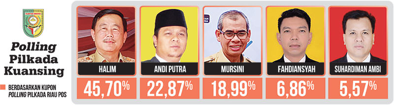 TELUK KUANTAN (RIAUPOS.CO) — Dukungan terhadap bakal calon bupati Kabupaten Kuansing Mursini pada polling aspirasi pembaca Riau Pos kembali mengalami kenaikan. Berdasarkan penghitungan Kamis (26/3), dukungan terhadap Bupati Kuansing itu naik tipis di banding sebelumnya.