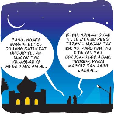 Memang, semue jamaah yang datang memakai masker. Dudok pon bejaghak. Alhamdulillah, semue patuh. Maklom musim kopid ni kalau tak hati-hati bise terancam. Bukan Mak Joyah, yang