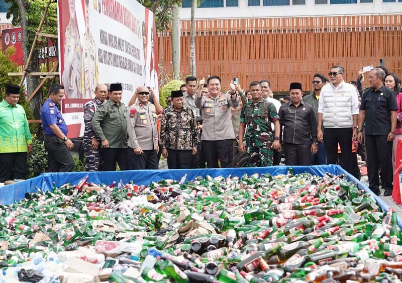 Kapolda Riau Irjen Pol Mohammad Iqbal bersama forkopimda dan tokoh masyarakat Riau saat pemusnahan barang bukti minuman keras di Mal Pelayanan Publik (MPP) Pekanbaru, Kamis (27/2/2025).