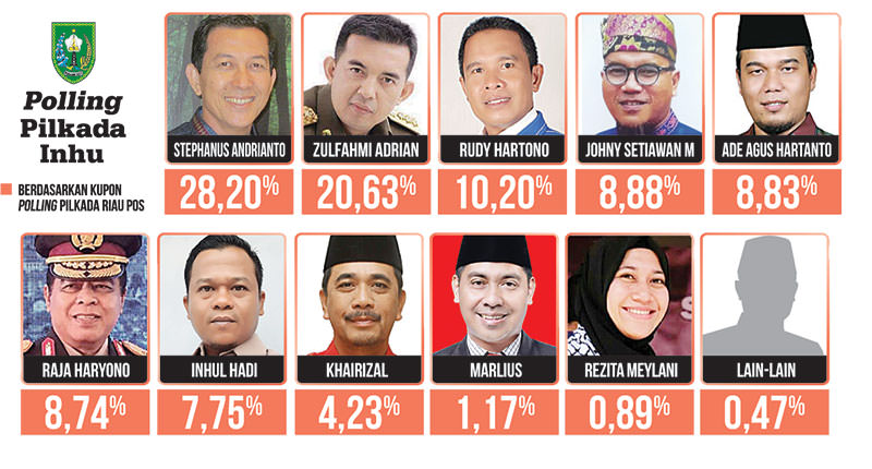 "Stephanus masih merajai polling. Bahkan sudah hampir satu bulan ia kokoh berada di puncak tanpa ada balon lain yang mendekati dukungannya," sebut Direktur Riau Pos M Hapiz, Jumat (27/3). Di peringkat tujuh ada nama Inhul Hadi yang mendapat dukungan 7,75 persen.