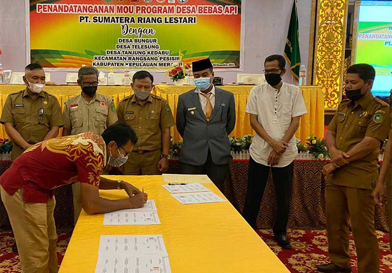 (RIAUPOS.CO) – PT Sumatera Riang Lestari (SRL) Blok V, sebuah perusahaan Hutan Tanaman Industri (HTI) yang beroperasi di Pulau Rangsang, menandatangani nota kesepahaman Desa Bebas Api (Free Fire Village) dengan tiga desa di Kecamatan Rangsang Pesisir. Ketiga desa tersebut adalah Desa Bungur, Desa Telesung dan Desa Tanjung Kedabu, Kecamatan Rangsang Pesisir, Kabupaten Meranti, Provinsi Riau.
