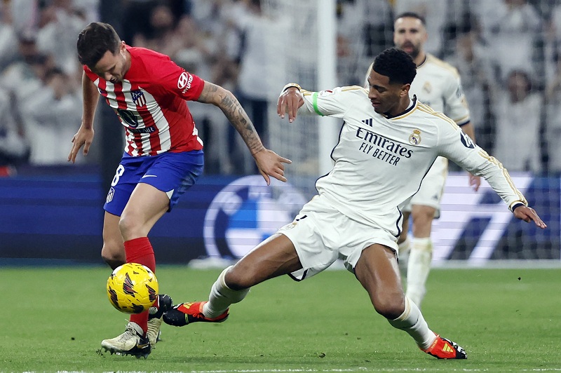 Gelandang Atletico Madrid, Saul Niguez (kiri), berebut bola dengan gelandang Real Madrid, Jude Bellingham, dalam lanjutan La Liga Spanyol di Stadion Santiago Bernabeu, Madrid, Senin (5/2/2024). (AFP)