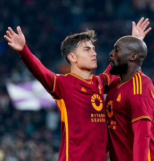 Penyerang AS Roma Paulo Dybala bersama dengan Romelu Lukaku merayakan gol saat berhadapan dengan Cagliari dalam lanjutan Serie A, Selasa (6/2/2024). (afp)