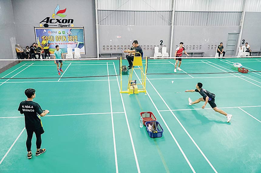 Para pemain sedang bertanding pada Turnamen Bulutangkis Riau Open di GOR Acxon Sport, Jalan Kayu Manis, Pekanbaru, Rabu (18/12/2024). ( DEFIZAL/Riau Pos)