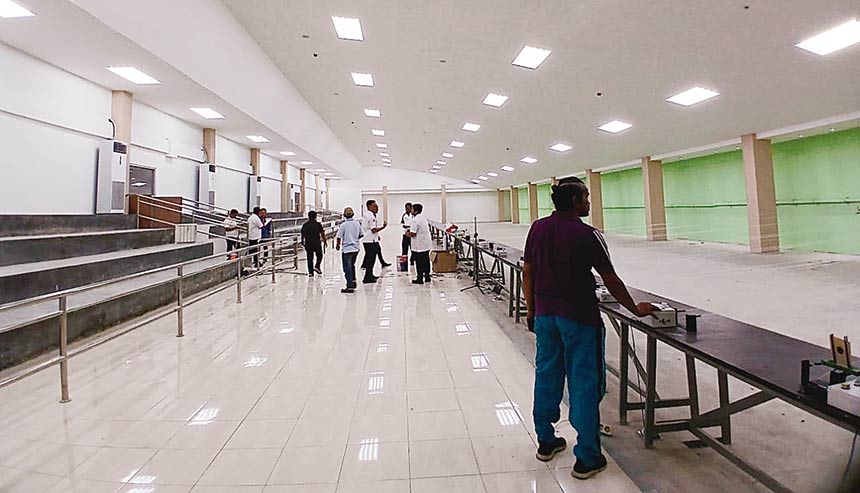 Perwakilan Dinas PUPR-PKPP Riau dan Dispora Riau mengecek hasil pekerjaan rehabilitasi Hall Menembak Sport Center Rumbai, baru-baru ini. Venue ini sudah bisa difungsikan, namun baru bisa disewakan tahun depan. (DISPORA RIAU UNTUK RIAU POS)