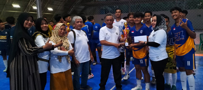 Manajemen disaksikan Pembina Spartan Cup II Mirshal menyerahkan piala bergilir Spartan Cup II di Lapangan Futsal Aero Sport Pekanbaru, Ahad (21/1/2024). (prapti Dwi Lestari/riaupos.co)