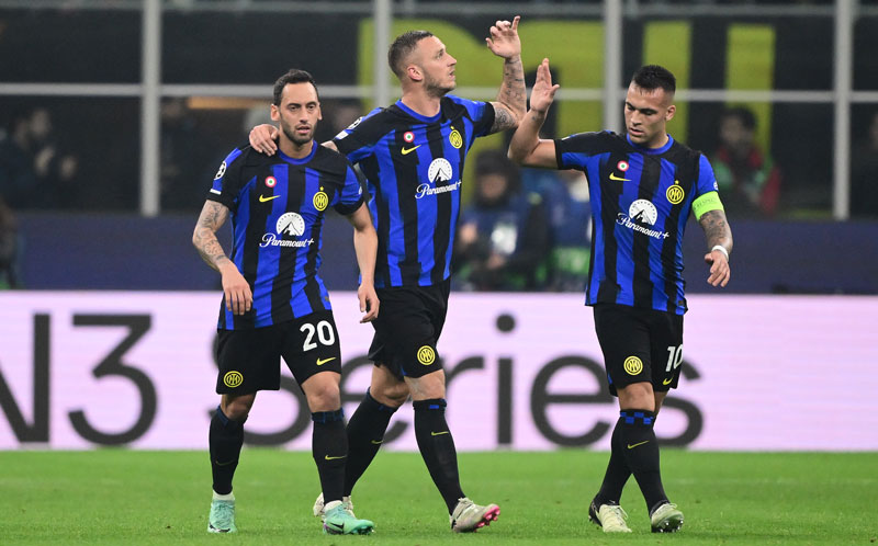 Para pemain Inter Milan merayakan gol saat berhadapan dengan Atletico Madrid pada leg pertama babak 16 besar Liga Champions di Giuseppe Mazza, Milan, Rabu (21/2/2024). (AFP)