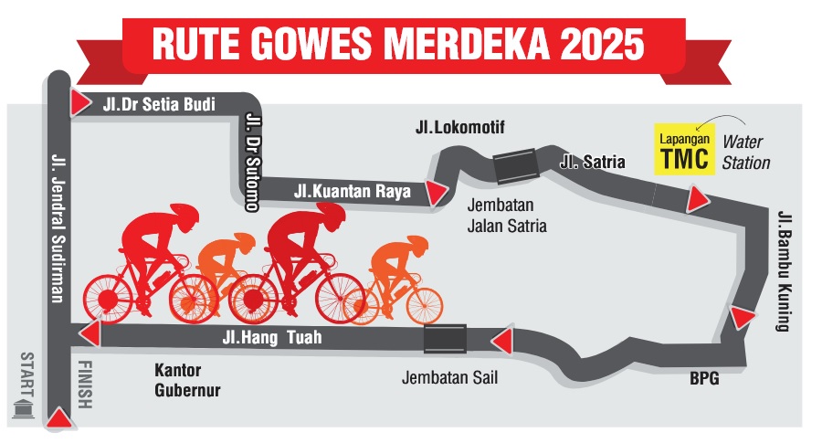 PEKANBARU (RIAUPOS.CO) – Riau Pos Gowes Merdeka 2025 bakal digelar Ahad (24/8) besok. Antusiasme masyarakat begitu tinggi, terbukti sudah lebih dari 1.000 peserta mendaftar, baik dari komunitas maupun individu. Kegiatan ini digelar Riau Pos bekerja sama dengan Pemerintah Provinsi Riau, dengan start dan finish di Halaman Kantor Gubernur Riau, tepat di depan Tugu Zapin.