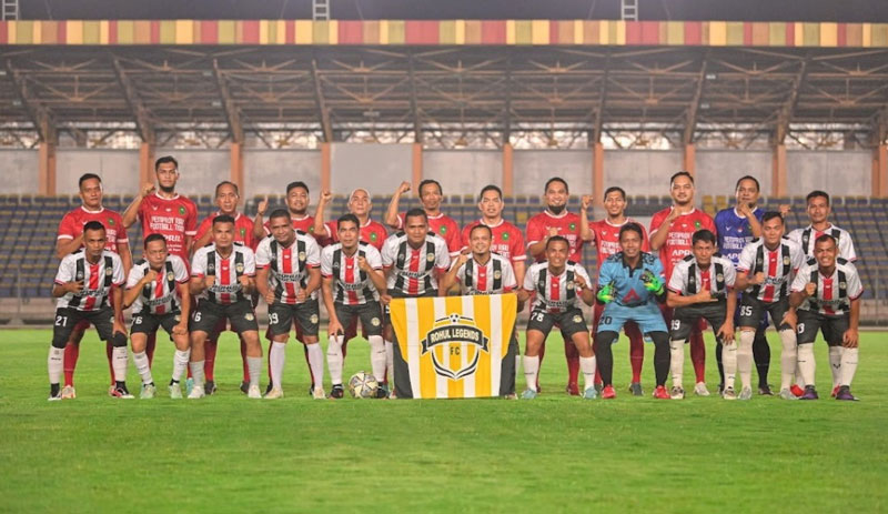 Pemain Dispora Riau (belakang) foto bersama dengan pemain Pemkab Rohul (depan) di Stadion Kaharuddin Nasution Rumbai, Pekanbaru, Sabtu (24/2/2024). (Dispora Riau untuk riaupos.co)