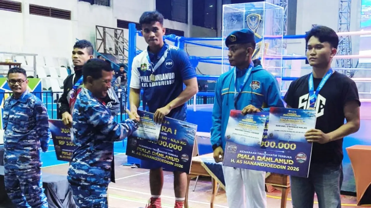 Petinju Kuansing Iman Josua Simorangkir saat naik podium dan berhasil meraih medali emas pada Kejuaraan Tinju Danlanud Cup 2026 di Bangka Belitung, Sabtu (25/4/2026). (PARTINA KUANSING UNTUK RIAU POS)