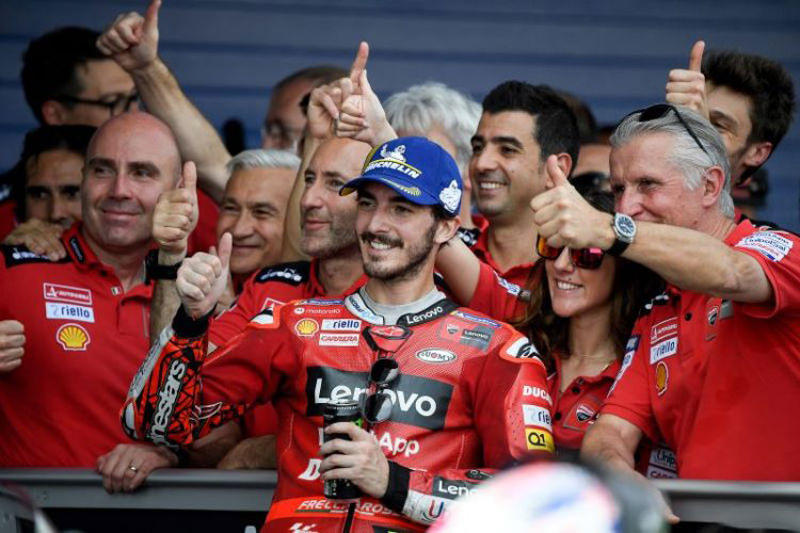 Di podium teratas jagoan pabrika Ducati Francesco Bagnaia sukses menyabet kemenangan di MotoGP Italia. Kemenangan itu menjadi sempurna karena Bagnaia adalah rider Italia, mengendarai motor Italia, dan juara di sirkuit Italia. Juga kemenangan pertama bagi Bagnaia di Mugello.