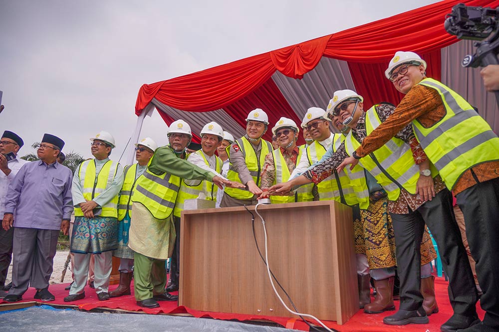 Menteri Pendidikan Dasar dan Menengah (Mendikdasmen) RI Prof Dr H Abdul Mu’ti MEd dan para pimpinan menekan tombol grand launching PMB dan ground breaking gedung MMT Umri, Jumat (10/1/2025). (Humas Umri untuk Riau Pos)