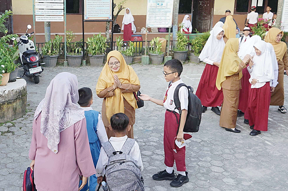 Sejumlah guru menyambut murid yang baru masuk sekolah di SDN 165 Jalan Serasi Pekanbaru, Senin (14/7/2025). (EVAN GUNANZAR/RIAU POS)