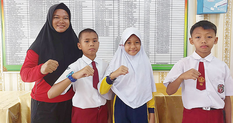 Guru Olahraga SDN 148 Pekanbaru bersama tiga muridnya yang berhasil menjuarai cabang olahraga bela diri, Senin (12/2/2024). (Herianto Baserah/RiauPos.co)