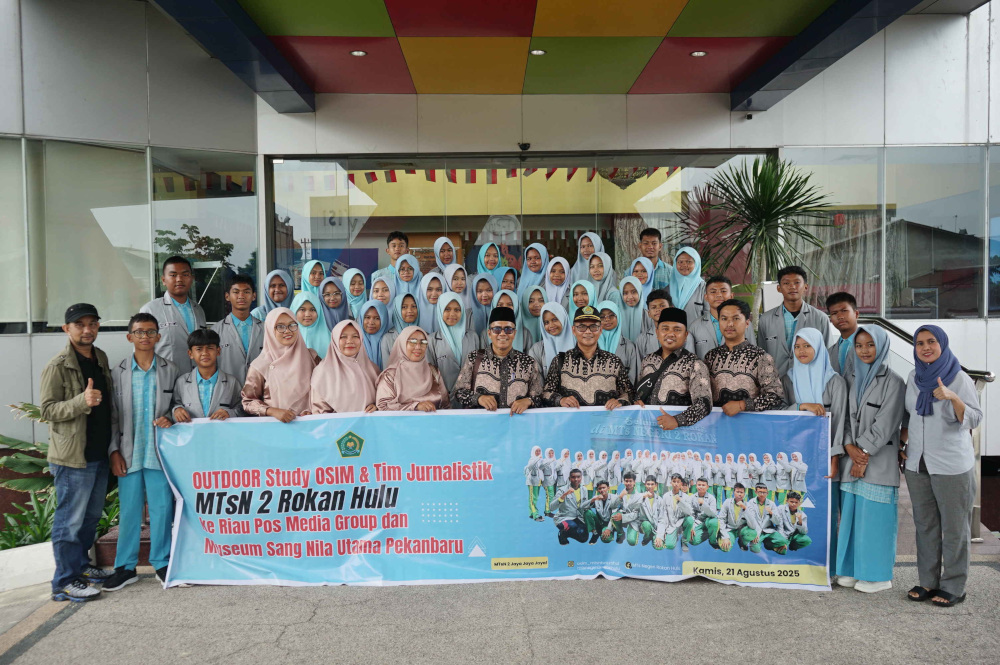 Kepala MTsN 2 Rokan Hulu Akhirman bersama majelis guru dan para siswa/wi foto bersama Redaktur Pelaksana (Redpel) Riau Pos Syahrul Mukhlis (kiri) dan Penanggung Jawab Umum Rike Febriyani (kanan) saat kunjungan ke Kantor Riau Pos di Graha Pena Riau, Jalan HR Soebrantas, Pekanbaru, Kamis (21/8/2025).