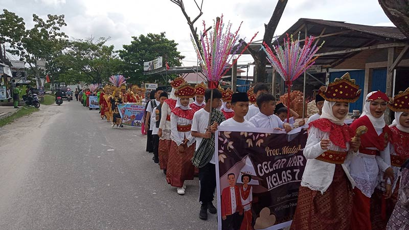 Pelajar kelas VII MTsN 3 Pekanbaru melaksanakan pawai di Jalan Unggas, Kelurahan Simpang Tiga, Kecamatan Bukit Raya, Rabu (20/11/2024). (MTsN 3 untuk Riau Pos)