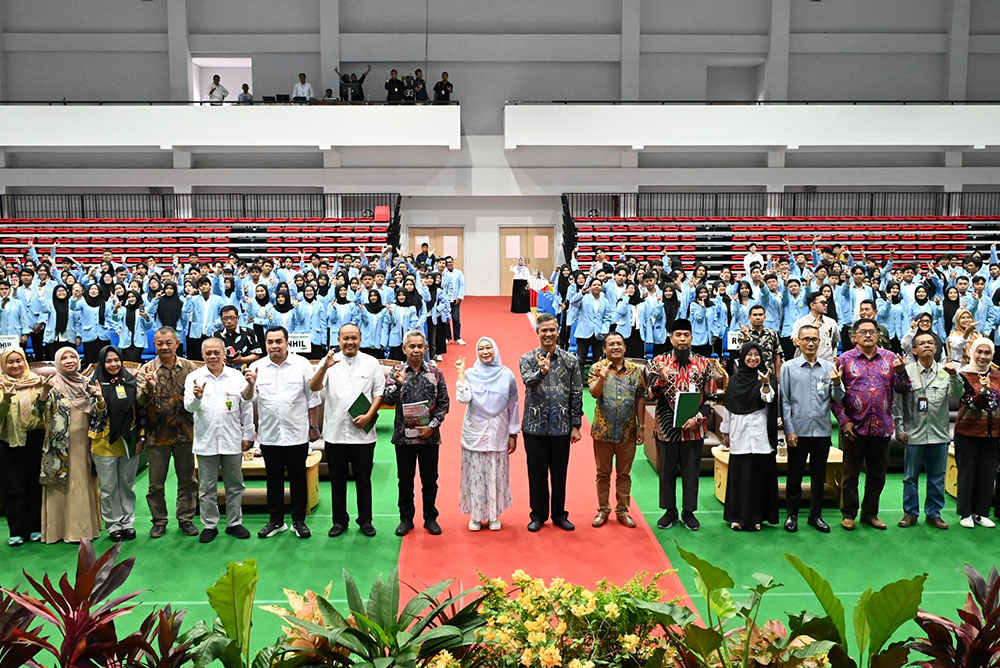 Civitas akademika Unri, Pj Sekdaprov Riau M Job Kurniawan AP MSi foto bersama usai pelepasan mahasiswa Kukerta Unri 2025 di Gedung Student Center Kampus Bina Widya, Panam, Sabtu (21/6/2025).